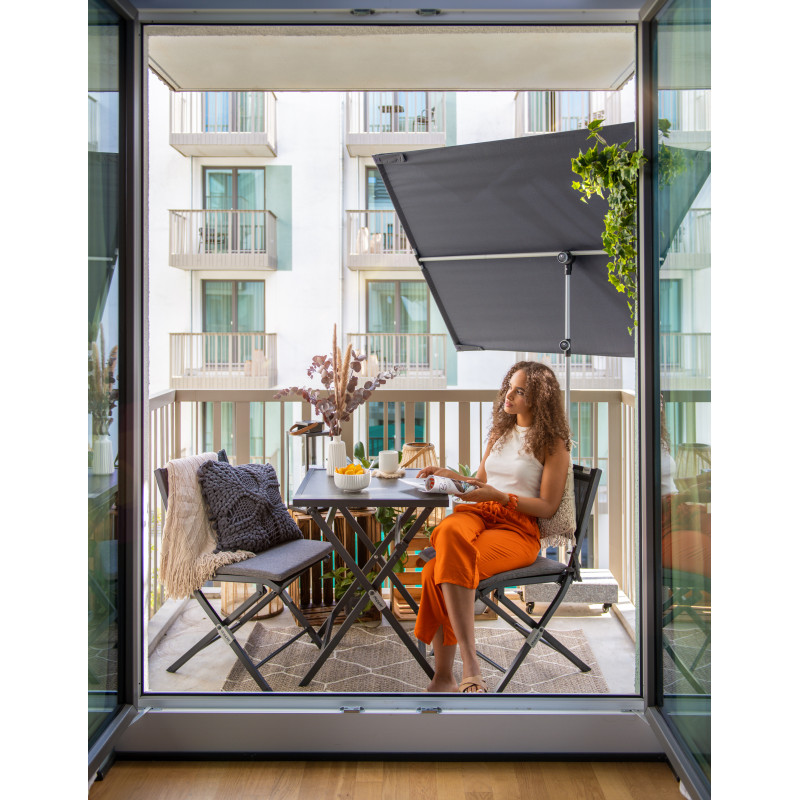 Balkónová clona je špeciálne určená pre balkóny a je prispôsobiteľná pohybu slnka. Je univerzálna, pretože ju možno otáčať o 360°, nastaviť výšku alebo nakloniť / posunúť na stranu. Balkónová clona je vhodná nielen pre balkóny, ale aj vďaka mnohým funkciám pre záhradu a terasu.Clona je vyrobená z vodeodpudzujúce polyesterovej tkaniny, ktorá má dobrú UV ochranu 50+. Ďalšou výhodou je, že clona je snímateľná a je ju možné prať v ruke maximálne na 40 °.