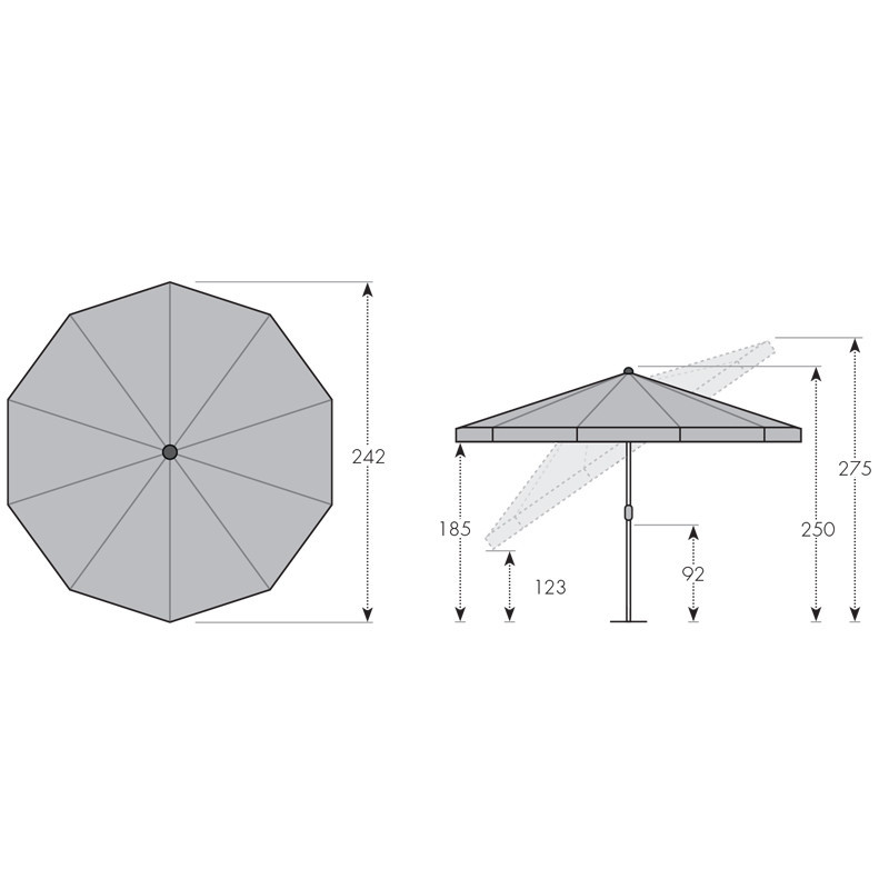Tento slnečník je ideálnym spoločníkom na balkón alebo terasu. Rám slnečníka je vyrobený z ocele v antracitovej farbe s epoxidovou povrchovou úpravou. Slnečník umožňuje komfortné naklopenie strechy. Poťah je vyrobený z kvalitného nepremokavého polyesterového materiálu bez švov, ktorý je odolný poveternostným vplyvom s dobrou UV ochranou 50+. Vhodný pre gastronomické zariadenie.